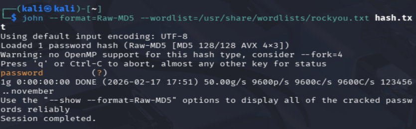 john --format=Raw-MD5 --wordlist=/usr/share/wordlists/rockyou.txt hash.txt